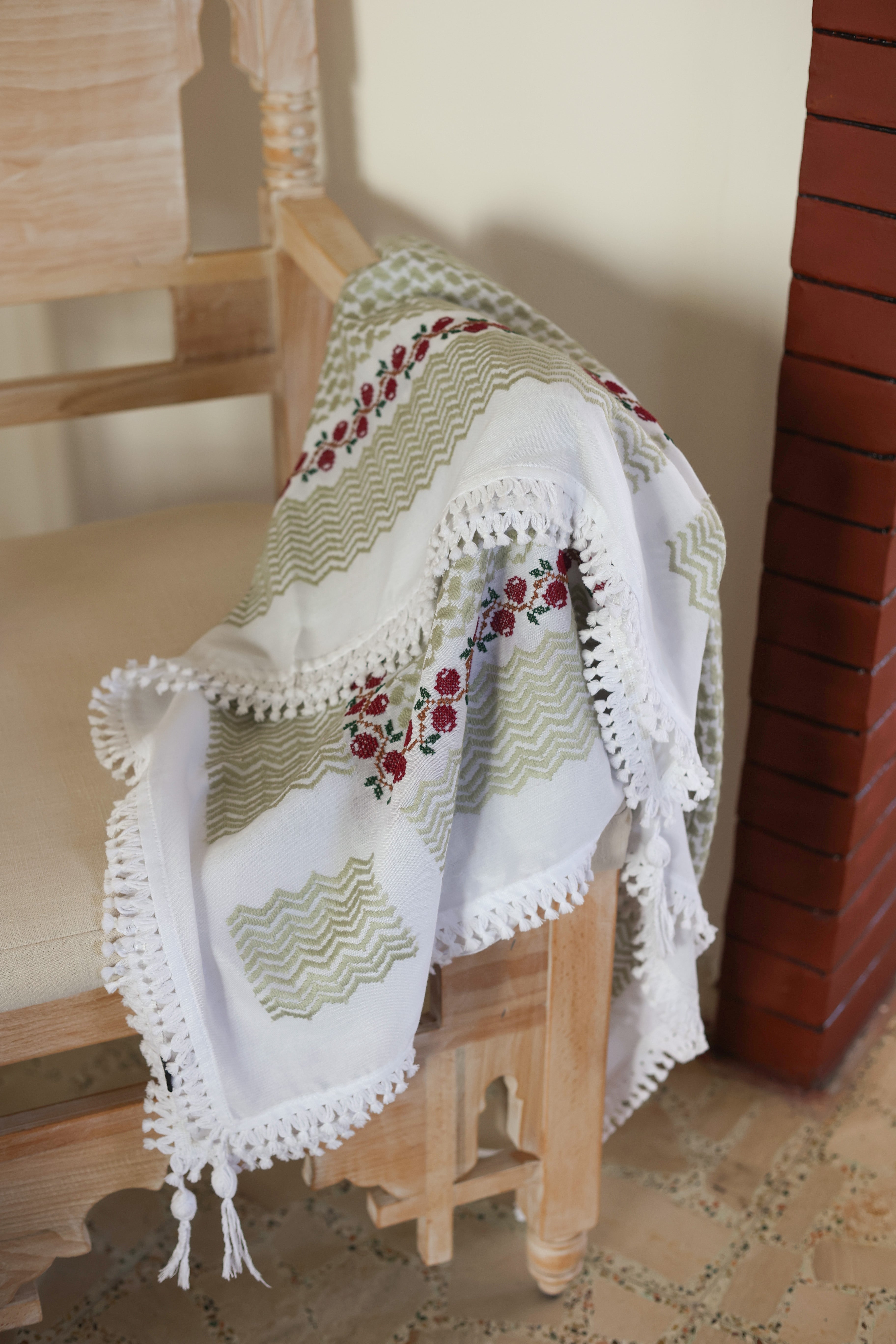 The Zaytoun Olive Green Keffiyeh is a tribute to Palestinian heritage, this authentic keffiyeh scarf is traditionally handcrafted in our family factory to preserve cultural legacy and craftsmanship. This Keffiyeh featuring handmade olive tatreez motifs embodies the enduring spirit of the Palestinian people, making it a meaningful piece of symbolism and Arab cultural identity.